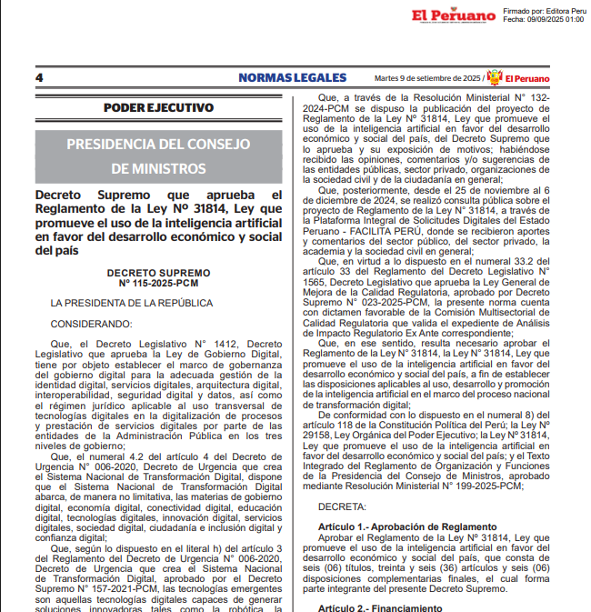 SE APROBÓ EL REGLAMENTO DE LA LEY N° 31814 LEY QUE PROMUEVE EL USO DE IA EN FAVOR DEL DESARROLLO ECONÓMICO Y SOCIAL DEL PAÍS